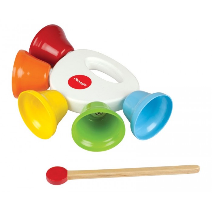 Детский игрушечный музыкальный инструмент - Колокольчики, изготовленный французской компанией Janod, предназначен для детей от 3 лет. Интернет-магазин КуклаДом предлагает Вашему вниманию высококачественные музыкальные детские игрушки. Инструмент изготовлен из натуральных безвредных материалов. Деревянное основание удобно держать в руке. Пять разноцветных колокольчиков - 5 нот. Колокольчики изготовлены из металла и при ударе деревянной палочкой издают очень нежный и тонкий звук.