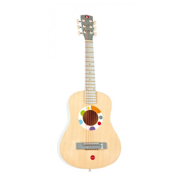 Большая гитара для детей от 5 лет. Коллекция детских музыкальных инструментов производства компании Janod, среди которых представлена деревянная игрушка «Большая гитара», изготовлена из натуральных безопасных для детей материалов высокого качества. Гитара имеет настоящие колки и струны, поэтому прекрасно держит лад и хорошо звучит. При необходимости ее можно настраивать. Это яркая и веселая игрушка, с помощью которой Вы сможете привить ребенку любовь к музыке, развить его музыкальный слух и чувство ритма. Расцветка инструмента очень нежная и красивая - разноцветные шарики на ослепительно белом фоне радуют глаз. Деревянная гитара для детей – игрушка, разработанная самыми лучшими французскими дизайнерами, имеет очень приятную и гладкую поверхность. Если Вы хотите сделать полезный и интересный подарок своему малышу, то детская игрушка-гитара, купить которую можно в нашем интернет-магазине по приемлемой цене – прекрасный выбор, который обрадует начинающего музыканта.