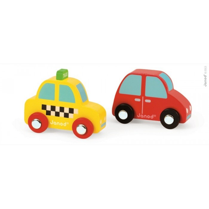 Набор "Желтое такси и красный автомобиль", производства французской компании Janod, предназначены для детей старше 1,5 лет. Все элементы, представленного набора, деревянные. Такси стилизовано под настоящее: желтая машинка с черно-белыми шашечками на боку, на крыше зеленая табло с надписью "taxi", красные колеса с металлическими дисками. У красненькой машинки черные колеса с металлическими дисками, как у настоящего автомобиля.