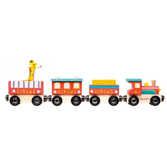 Железная дорога и паровозики с вагончиками были и остаются одними из самых популярных игрушек. Изготовленные из натурального дерева, паровоз и вагоны, перевозят все необходимое для веселого циркового представления: артистов, животных и декорации. Паровоз и 3 вагончика сцепляются друг с другом при помощи магнитов. Общая длинна состава - 32 см, а высота самого большого вагона 9,5 см.