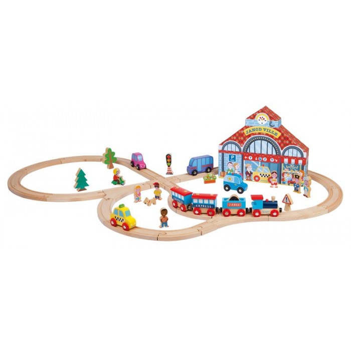 Поезд на магнитиках "Город", производства французской компании Janod, предназначен для детей старше 3 лет. Железная дорога и паровозики с вагончиками были и остаются одними из самых популярных сюжетных игр. В комплект входит 46 элементов - это рельсы, паровоз с вагонами, здание вокзала, фигурки людей, животных, растения, автомобили, дорожные знаки. Все они изготовлены из натурального дерева. Паровоз и 3 вагончика сцепляются друг с другом при помощи магнитов.