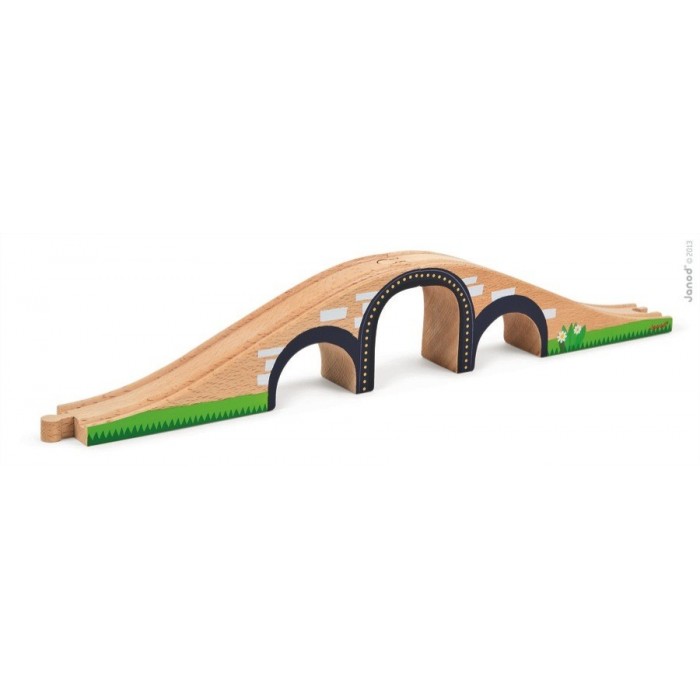 Набор «Железная дорога «Мост с 3 арками»», производства французской компании Janod, предназначен для детей от 3 лет. Набор из 2 элементов изогнутой формы, образующих мост с тремя пролетами, изготовлен из натурального дерева. Рельсы соединяются по принципу пазла.