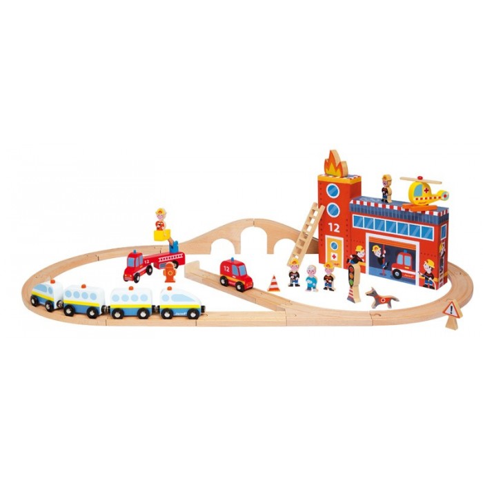 Железная дорога "Пожарная станция", 36 элементов, производства французской компании Janod, предназначена для детей от 3 лет.