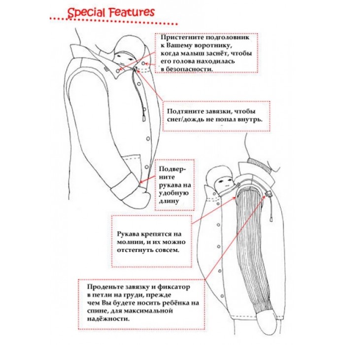 - комфортное ношение ребёнка с рождения до ясельного возраста благодаря продуманной поддержке головы и слегка расклешённому подолу для ног ребёнка;