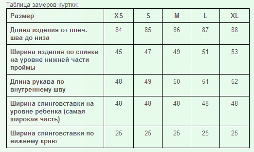Утеплитель - термофинн 200. Подкладка - полиэстер. Комфортная температура ношения без ребенка -15С. Комфортная температура ношения с ребенком (в слинге под курткой) -20С.